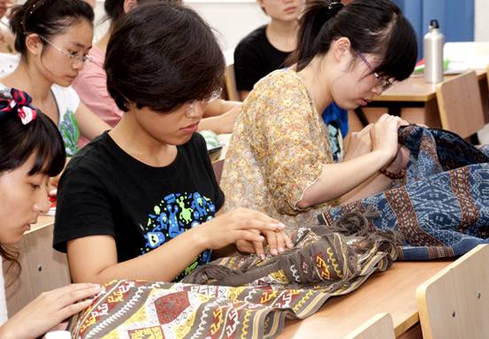 感动和激动之余,郭 教授与广大师生共同回顾黎锦的历史,对黎锦的文化和图案做了重点的讲解,并对黎锦织造技术、染色原理、元素、黄道婆与黎锦 等方面做了概括和总结,让参与设计团队的同学和 老师们有更加深入的理解,并且通过实物的展示,让设计者融入到黎锦的文化中。