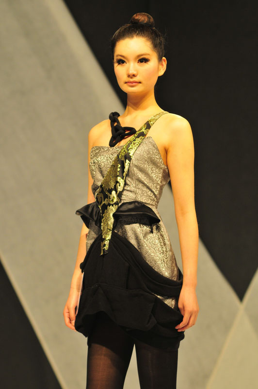 学生作品 此次比赛设3个奖项,5个获奖名额,其中三等奖2名,二等奖2名,金奖一名。三等奖的获奖作品,一个以海洋为设计元素,将蓝色拉链创意为描绘大海的层层波浪,拉链的凹凸起伏为原本单调的斗篷式上衣增添了机理效果,古典简易的妆容为作品平添了几分中性的挺拔之感。另一个获奖作品为此次比赛唯一的牛仔布作品,随意而宽松的上身加上以拉链为塑边工具的大裙摆,颇有一番街头文化的韵味,随性与高雅并存;二等奖的两件获奖作品有着统一的风格,用坚挺的拉链塑造硬朗的立体几何图案,利用拉链的开合作用改变裙身的形状,使原本以直线分割的几何形改变成柔和的曲线图案,从真正意义上诠释了拉链的功能性。YKK带来的不应该只是辅助服装的成型,而更应该是成为服装不可或缺的成分,改变服装的原始状态,使其为穿者提供更多便利;一等奖的得主,似乎是在所有人的意料之中,而与此相反,在采访的过程中,获奖者表现出意料之外的兴奋。一等奖的作品以灰黑为主色调,有着精致的裁剪,款式则是来自于男式西装,服装与模特中性干练的妆容相得益彰。但巧妙之处并不在于西装的独特裁剪,而是来自拉链为服装平添的几分传统色彩,排式拉链的斜式裁剪在肩部与胯部的应用是来自于书法中的撇捺,长短不一的拉链,加上银色的点缀效果,以及机理效果,实在是将经典与未来演绎的十分绝妙,中性气质让刚硬与妩媚展现的淋漓尽致,设计师细致的造型让观者感受到她的别有用心。金奖的作品符合YKK大赛的目的,重新审视了拉链的功能性与美学性,小小的拉链的确不再是辅料,而是不可或缺的时尚成分。 不可否认的是,拉链在这场秀上成了最大的主角,发挥了最重要的作用。拉链就是用于“结合”两个不同部分的重要工具,而真正能意会到“结合”作用的人便成为了最大的赢家。是经典还是未来,是刚硬还是妩媚,是温文尔雅还是玉树临风,只在于开合之间,而这次大赛最大的获奖者,从她身上更能看到的是,不为比赛而进行的较量才是艺术与商业间最恰当的“结合”。 YKK让这次角逐充分展现YKK企业风采,此次大赛不仅为校企合作拓展了交流平台,更为新一辈小设计师们提供了锻炼机会,体验到科技与艺术并存对现代服装行业的不可或缺的作用。