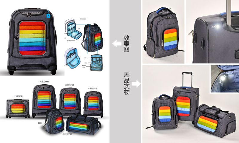 本次展出的设计作品中有两个系列的箱包是去年时尚产品工作室和新秀集团共同研发的,一个系列是利用当时库存面料来进行的设计创想及配色设计,一个系列是针对于商务人士的混面料搭配,这两个系列相对于这次展出的其他展品而言显得更为成熟、更为完整、更容易被大众接受。