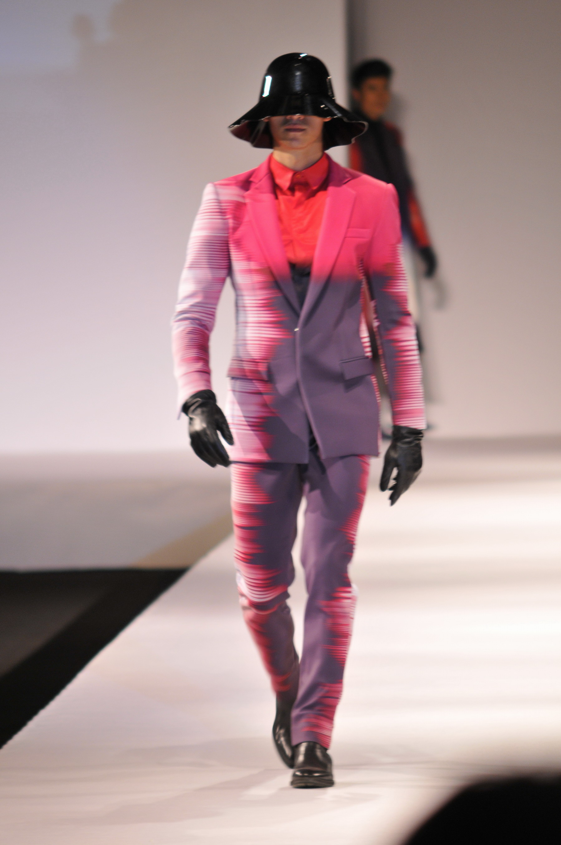 随着鼓声渐去,银幕上显现出一个圆环,象征着东华时尚周已扩大至“环东华”的规模,更预示着它将引领上海的时尚界走向国际。极富现代感的音乐响起,模特从神秘的后台踏出,首先映入眼帘的是黑红色调的男士西服,搭配极具现代感的密集针状条纹和爆炸图案设计,完美融合了男性风度与热情之美,而纯色的西服和低调的黑衬里更显设计师对男装独特的把握。随后,音乐转向柔和,舞台上也出现了女装的身影。一系列的暗色系宽肩长裙,时而左右时而内外的双拼色,突出了女性的华贵与率性;而露趾的高跟鞋加之偶尔出现的流苏,也让画面鲜活不少。忽然,一抹靓丽的玫红男装让观众眼前一亮,这稍显突兀的夏日风潮显然是又一位设计师的杰作。轻松的浅棕色凉鞋、同样粉红的鸭舌帽、条纹状的透明处理,夏日的热浪仿佛扑面而来。而此刻,设计师似乎给观众们开了个小玩笑:印有人头像的上衣搭配同色的短裤,如同是画像中的人物朝观众走来。还未欣赏完前一组的意味,又一套神秘的女装出现在眼前。头顶“种着”“塑料草”的宽沿大帽,里着皱褶柔美的丝质衣裙,外套垂坠的厚布外衣,搭配随意扎起的长短袜和手肘处的传统编织工艺,件件夺人眼球。怎么,你要说你已经眼花缭乱了?那还是让这个舞台为您放松眼球吧。下一位设计师巧妙地运用了黑白条纹的视觉错觉,形成了奇妙的扩大效果。此后,波西米亚风格的方帽与裙装、简洁的米色布料与方形手包、夸张的大片皮革、多层的结构设计、亮片的独到运用、水墨的晕染效果……每一位设计师都为观众带来了独特的视觉体验。