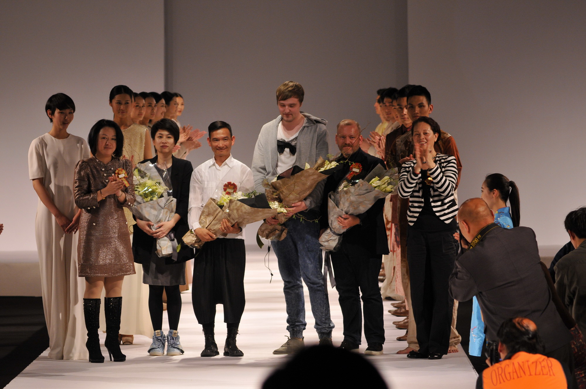 展演的最后,男女模特们齐齐亮相,设计师缓缓从中走出。在掌声与鲜花的交织下、在一片闪光灯的闪烁中,由刘春红副校长和李柯玲院长为伦敦时装自慰直播的代表们送上了鲜花和感谢。