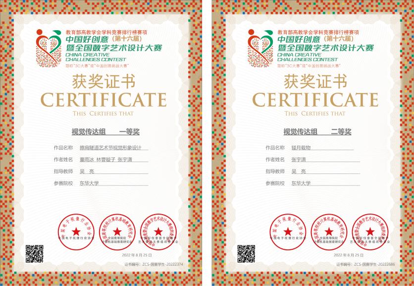 在全国投稿的众多参评作品中,我校服装与艺术设计院视觉传达系吴亮老师指导的2021级研究生童雨冰、林曹璇子、张宇潇的作品《擦肩隧道艺术节视觉形象设计》荣获视觉传达组一等奖,吴亮老师指导的2021级研究生张宇潇的作品《镂月载物》荣获视觉传达组二等奖,潘其老师指导的2019级本科生曾文亭、郑心慧、谢欣然的作品《魔都幻夜》荣获视觉传达组二等奖,赵蔚老师指导的2018级本科生徐彬芸的论文《基于数字技术的互动体验在形象设计服务品牌中的应用设计》荣获学术理论组二等奖,2021级研究生蒋金洋的作品《KUKA教育品牌与IP设计》荣获漫画插画组三等奖。