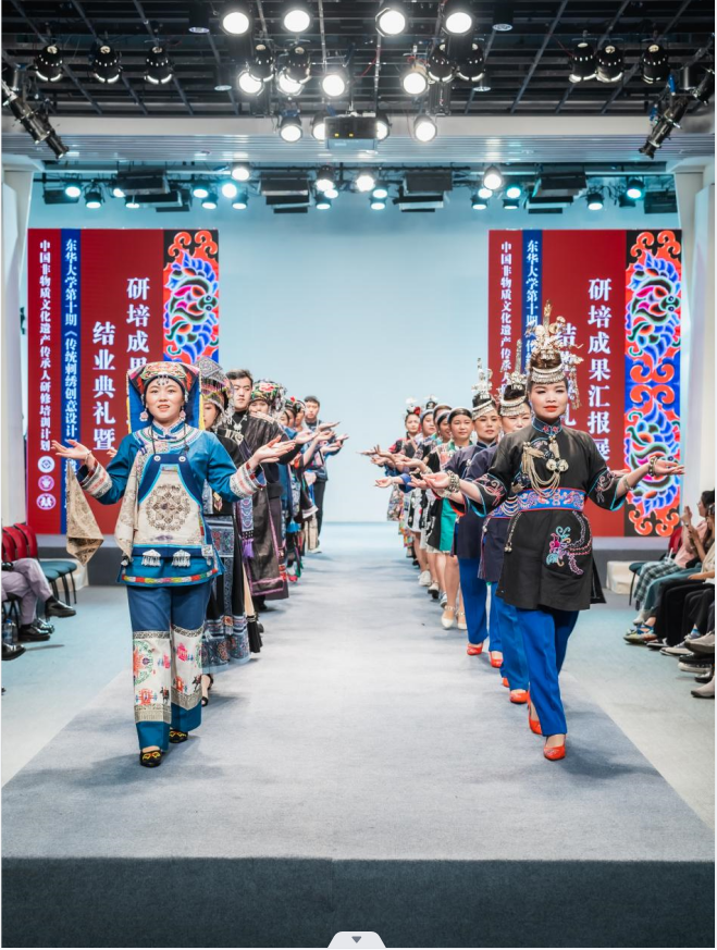 秀演以团结紧张、严肃活泼的明快节奏回顾了贵州学员们在沪一个月丰富多彩的学习生活,接着便开始了22套结对时装的生动秀演。非遗传承是一项既需要热情也需要恒心,既需要守正也需要创新的事业。东华研培一直坚持年轻学子与非遗传承人“携手研培”的模式,每期研培,每位学员研培期间都需要完成一件和高校设计专业大学生共同设计的时装,通过结对实现传统与现代的对话。学子学员结对创新设计作品正是东华积极探索的结果。