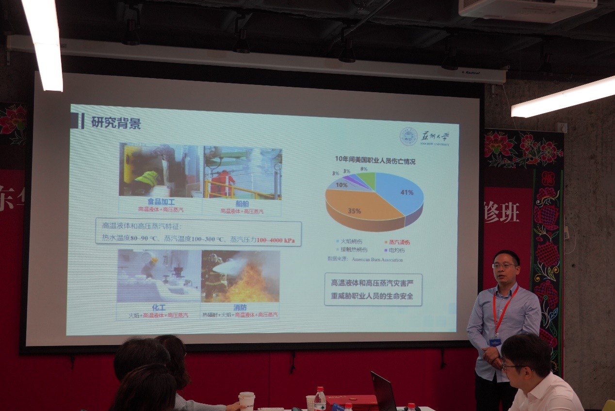 自慰直播 服装设计与工程系苏云副教授的报告主题是“相变微胶囊滴塑织物的制备及其在消防服中的应用研究”,他介绍了相变微胶囊在消防服中的应用现状及不足,提出了一种能够改善消防服热湿舒适性的工艺方法,并通过实验测试分析了不同滴塑工艺参数对消防服热湿舒适性、热防护性的影响,提出了最优参数设计。