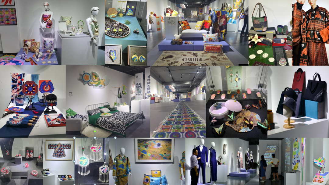 展厅现场陈列了老师与学员们历时三个多月的课堂学习研讨、课外调研采风、企业走访、设计制作的成果业绩。学员们在设计过程中,从各博物馆馆藏中提取灵感,结合当代人们的生活方式和审美趣味,融合拼布、刺绣、扎染、蜡染等民间工艺和制作技艺。