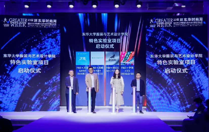 上海服装(集团)有限公司总经理朱健网、历峰中国人力资源招聘总监秦智强、ECCO大中华区首席产品官Sania Ma、浙江省宁海县委宣传部副部长王银宁共同开启首批特色实验室项目建设,探索推进联合科研团队建设,打造政校企协同育人新样板。